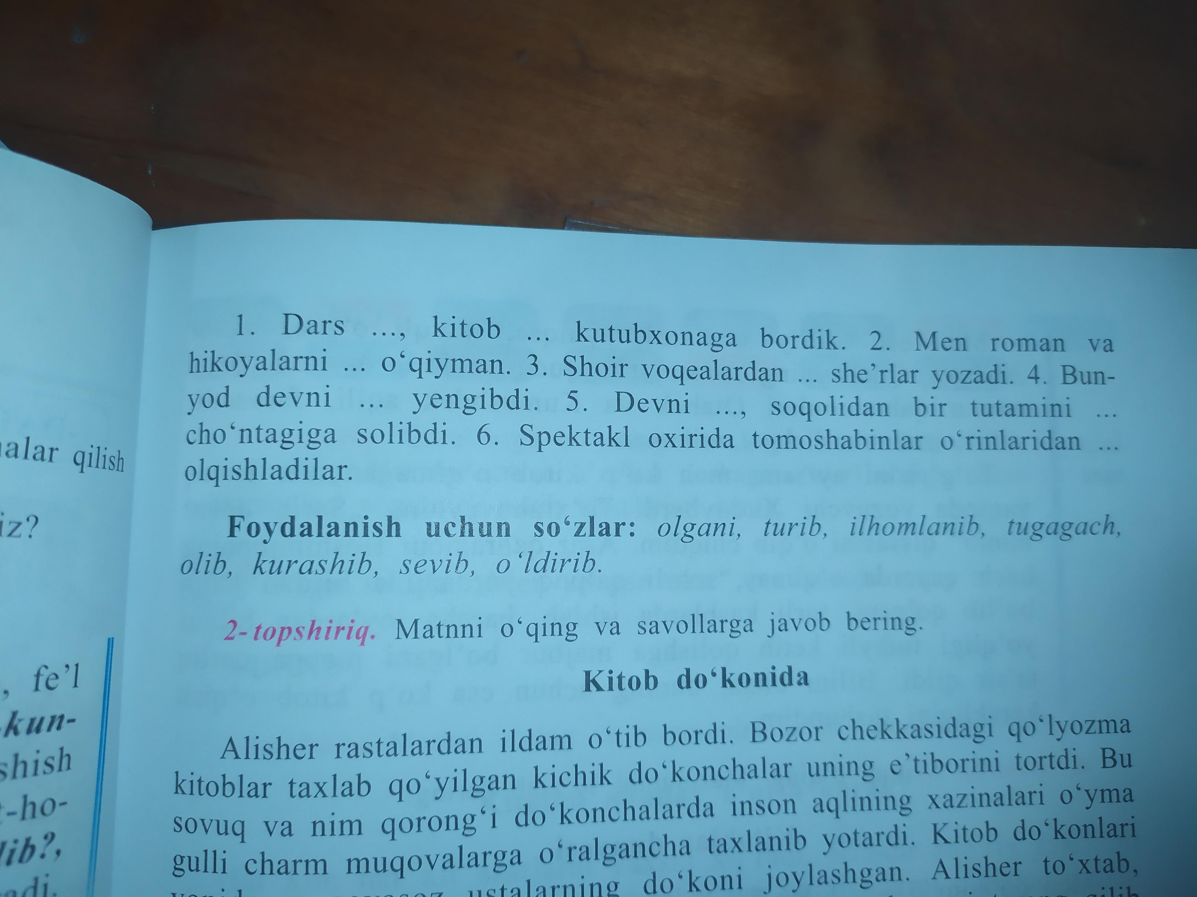 1-Dars tugagach , kitob olgani kutubxonaga bordik. 2-Men roman va hikoyalarni sevib o'qiyman. 3-Shoir voqealardan ilhomlanib she'rlar yozadi.4-Bunyod devni kurashib yengibdi.5-Devni o'ldirib , soqolidan bir tutamini olib cho'ntagiga solibdi.6-Spektakl oxirida tomoshabinlar o'rinlaridan turib olqishladilar.