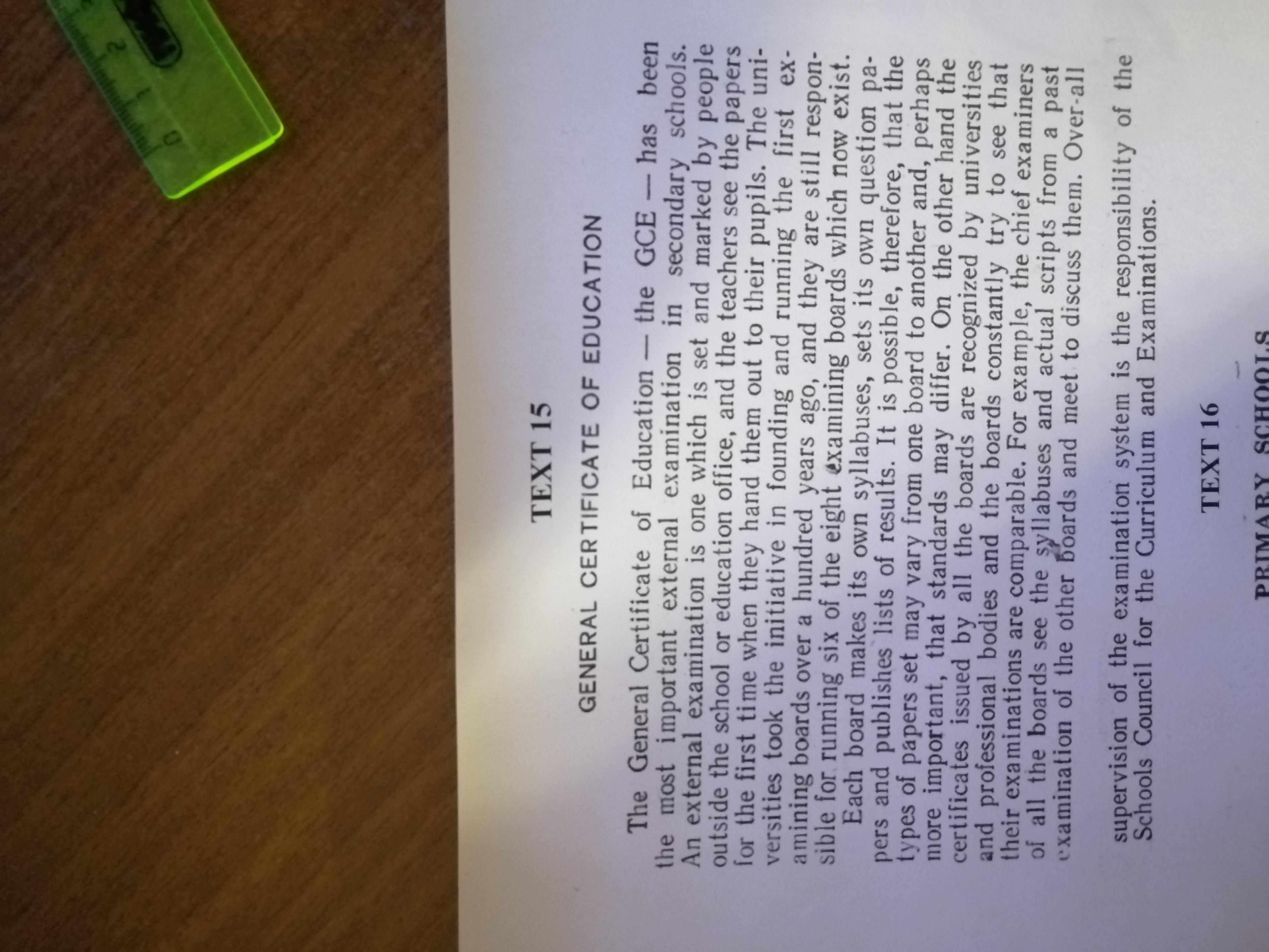 Английский текст: The General Certificate of education - the GCE - has been the most important external examination in secondary schools. An external examination is one which is set and marked by people outside the school or education office, and the teachers see the papers for the first time when they hand them out to their pupils. The universities took the iniative in founding and running the first examining boards over a hundred years ago, and they are stilll responsible for running six of the eight examining boards which now exist.