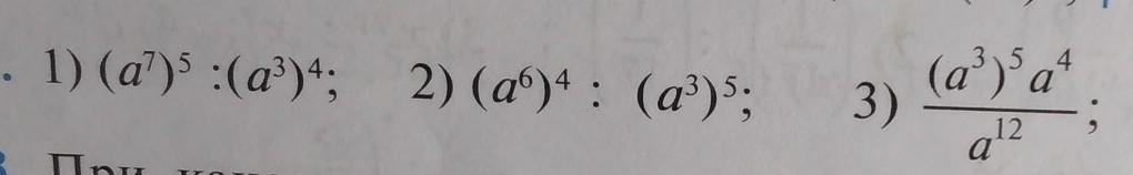 1) (a^7)^5:(a^3)^4=a^(7*5):a^(3*4)=a^35:a^12=a^(35-12)=a^23.