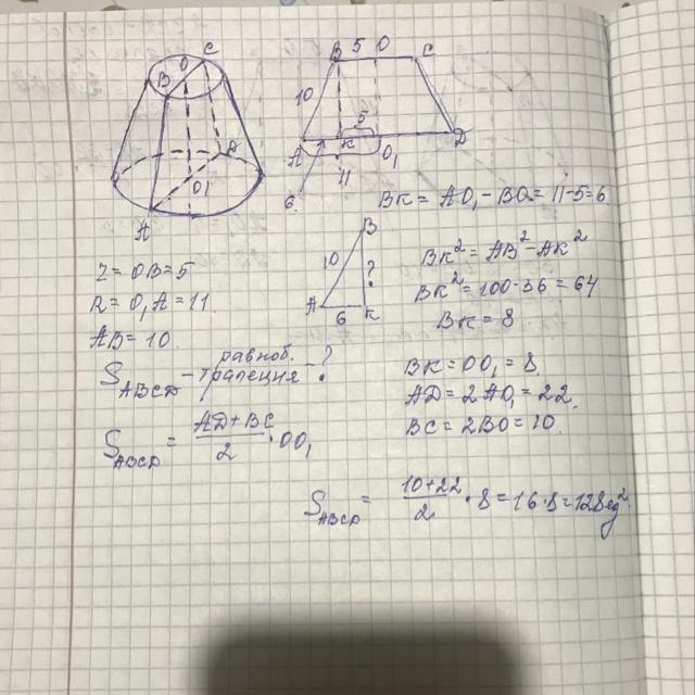 Радиусы оснований усеченного конуса равны 5 и 11, образующая -10. Найдите плошадь его осевого сечения.