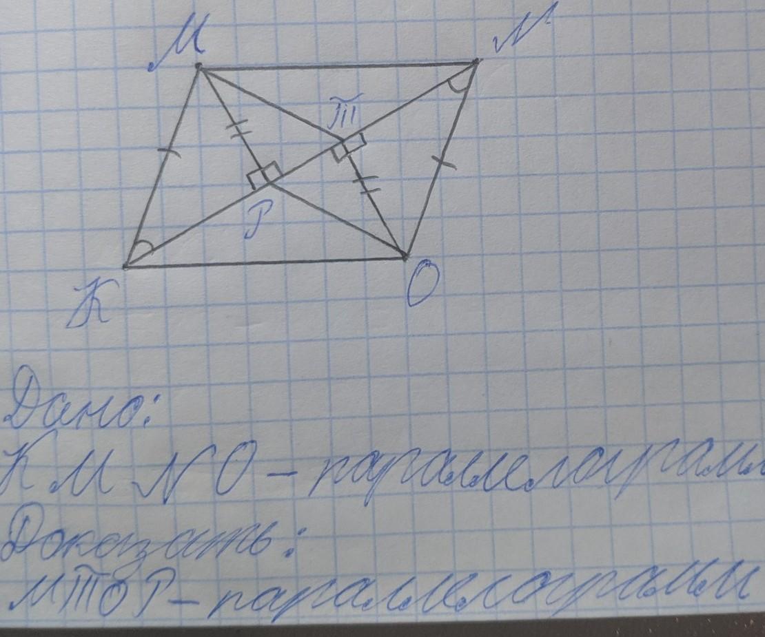 МР равно ТС, и при секущей КN углы МРТ и СТР - накрест лежащие, и они равны, следовательно МР параллельно ТС, а по 4-му признаку параллелограмма если в четырехугольнике 2 стороны равны и параллельны, то это - параллелограмм.