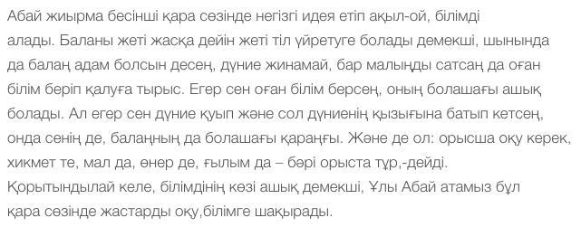 Жә, олай болса һәмма мақұлыққа да қара, өзіңе де қара, жанды бәрімізге де беріпті. Жанның жарығын бәрімізге де бірдей ұғарлық қылып беріп пе? Адам алдын, артын, осы күнін - үшеуін де тегіс ойлап тексереді. Хайуан артын, осы күнін де бұлдыр біледі, алдыңғы жағын тексермекке тіпті жоқ. Хайуанға берген денеге қара, адамға берген денеге қара. Адам екі аяғына басып тік тұрып, дүниені тегіс көрмекке, тегіс тексермекке лайықты һәм өзге хайуандарды құлданарлық, пайдасын көрерлік лайығы бар. Хайуанның бірі аяғына сеніп жүр, бір өзіңдей хайуанды құлданарлық лайығы жоқ. Адам өзі өзіне сенбесе, адамды да хайуан секілді қылып жаратса, ешнәрсеге жарамас еді. Хайуанға адамның ақылын берсе, мұнша шеберлік, мұнша даркарлік, бір-біріне ғылым үйретерлік шешендік салахият ол денеге лайықты келмейді. Қай өгіз шаһар жасап, құрал жасап, неше түрлі сайман жасап, сыпайылық шеберліктің үдесінен шығарлық қисыны бар? Бірақ адам баласы болмаса, бұл ғажайып ақылды және ғажайыппен жасаған денеге кіргізіп, мұнша салахият иесі қылғаны хиқметпенен өзге хайуанға сұлтан қылғандығына дәлел емес пе? Ол дәлел болса, адам баласын артық көріп, қамын әуелден алланың өзі ойлап жасағанына да дәлел емес пе? Енді адам баласының құлшылық қылмаққа қарыздар екені мағлұм болмай ма? - депті.