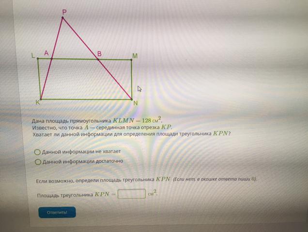 т.к. KA = PA, и AB||KN (KLMN - прямоугольник), AB - средняя линия треугольника KPN. Пусть, высота прямоугольника - h. Тогда высота треугольника PKN из точки P равна 2h по св-ву средней линии. Тогда S PKN = 1/2 * KN * 2h = KN*h = S KLMN = 128см²