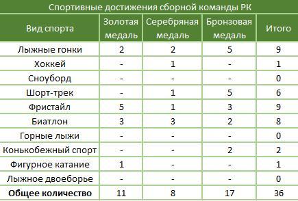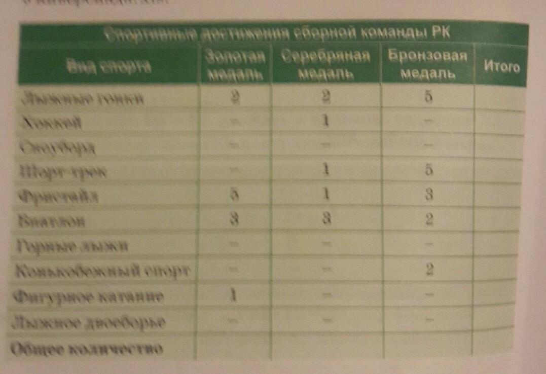Дана таблица результатов сборной Казахстана по отдельным видам спорта на Зимней Универсиаде-2017, которая проводилась в Алматы.. Вычислите общее количество бронзовых, серебряных и золотых медалей, завоеванных казахстанскими спортсменами. Заполните соответствующие ячейки таблицы.