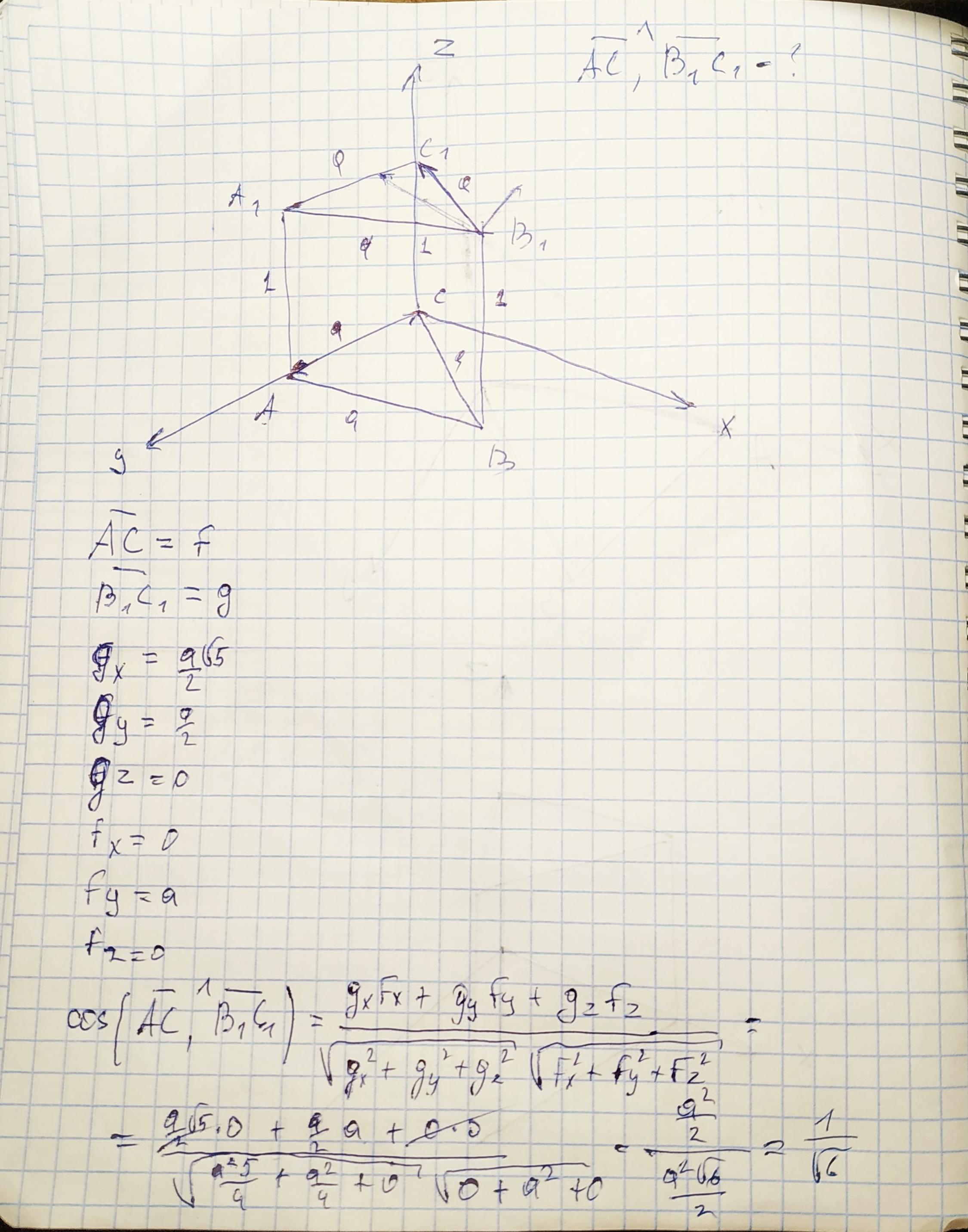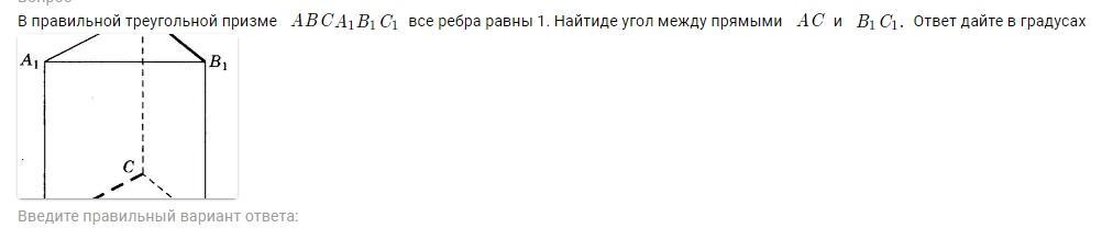 В правильной треугольной призме все ребра равны 1. Найти угол между прямыми AC и B1C1