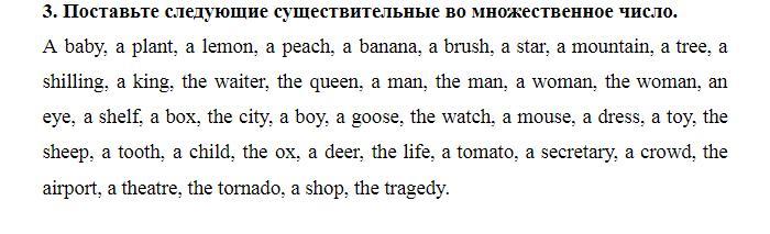 Babies, plants, lemons, peaches, bananas, brushes, stars, mountains, trees, shillings, kings, waiters, queens, men, women, eyes, shelves, boxes, cities, boys, geese, watches, mice, dresses, toys, sheep, teeth, children, oxen, deer, lives, tomatoes, secretaries, crowds, airports, theatres, tornadoes, shops, tragedies