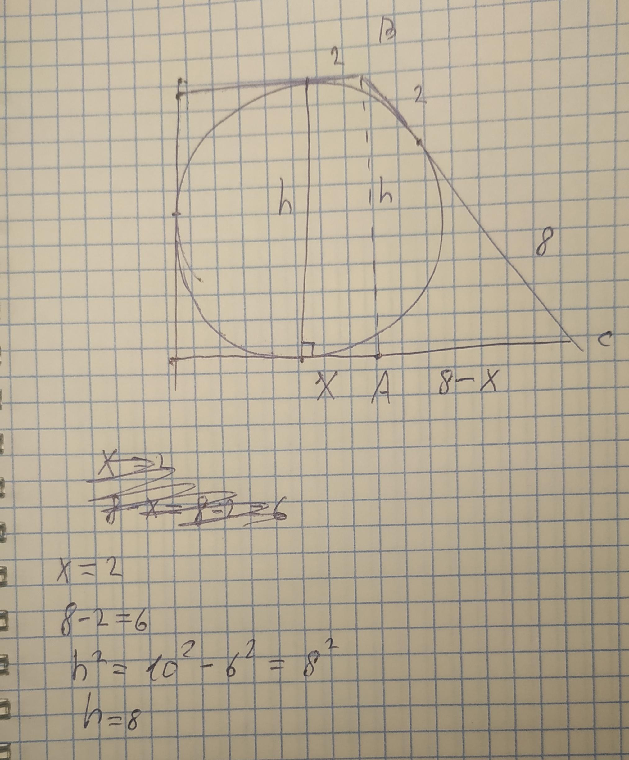 Дана описанная прямоугольная трапеция. Вписанная окружность делит точкой касания большую боковую сторону на отрезки, равные 2 см и 8 см. Найдите высоту трапеции.