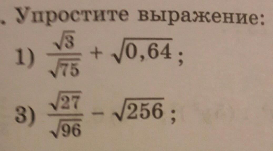 3) \frac{ \sqrt{27} }{ \sqrt{96} } -  \sqrt{256}   =  \frac{3 \sqrt{3} }{4 \sqrt{6} }  - 16 =  \frac{3}{4 \sqrt{2} }  - 16 =  \frac{3 \sqrt{2} }{8}  - 16