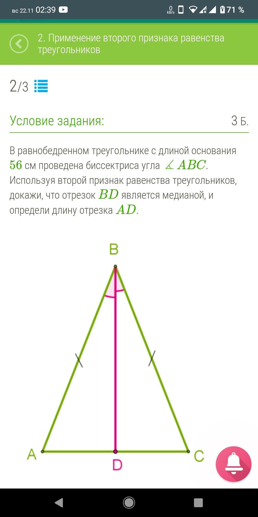 В равнобедренном треугольнике с длиной основания 56 cм проведена биссектриса угла ∡ABC. Используя второй признак равенства треугольников, докажи, что отрезок BD является медианой, и определи длину отрезка AD.
