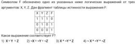 Символом F обозначено одно из указанных ниже логических выражений от трёх аргументов: X,Y,Z. Дан фрагмент таблицы истинности выражения F: