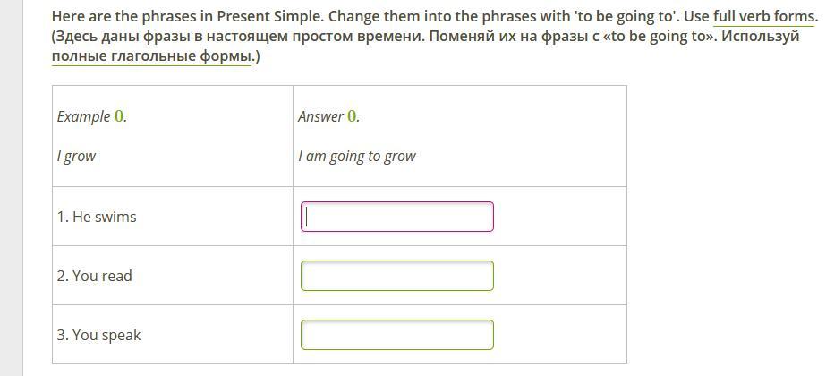 Here are the phrases in Present Simple. Change them into the phrases with 'to be going to'. Use full verb forms. (Здесь даны фразы в настоящем простом времени. Поменяй их на фразы с «to be going to». Используй полные глагольные формы.)