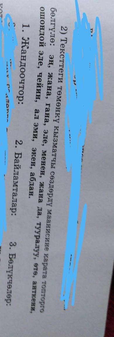 2) Тексттеги төмөнкү кызматчы сөздөрдү маанисине карата топторго