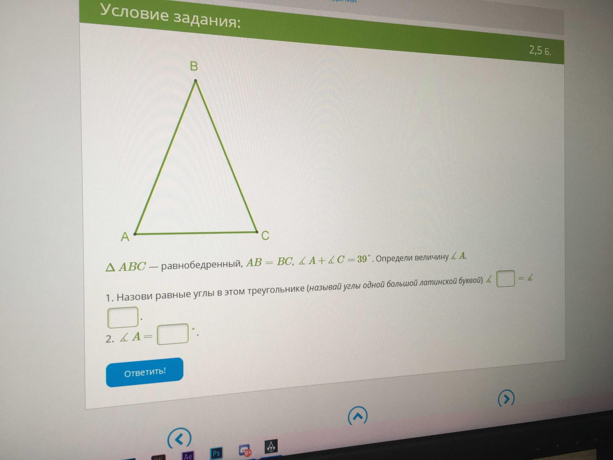 Зделайте пожалуйста ΔABC — равнобедренный, AB=BC, ∡A+∡C= 39°. Определи величину∡A.
