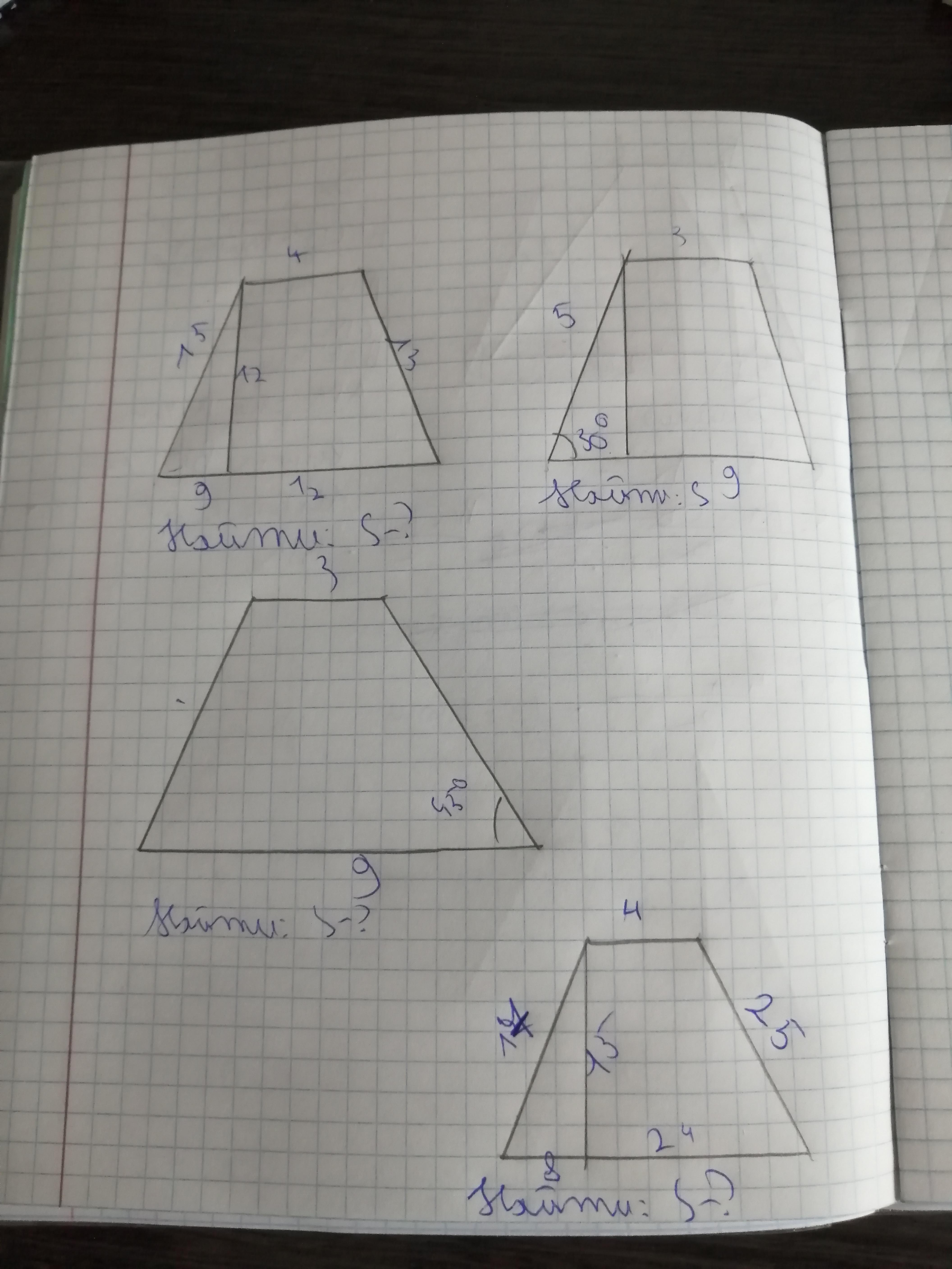 2) S=h(a+b)/2; a=3; b=9; h=? Высота (катет )лежит против угла в 30* и равна половине гипотенузы h=5/2=2.5;