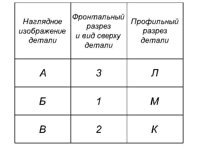 За виглядами та розрізами знайдіть наочні зображення деталей та профільні розрізи. Відповіді запишіть у таку таблицю в зошиті.