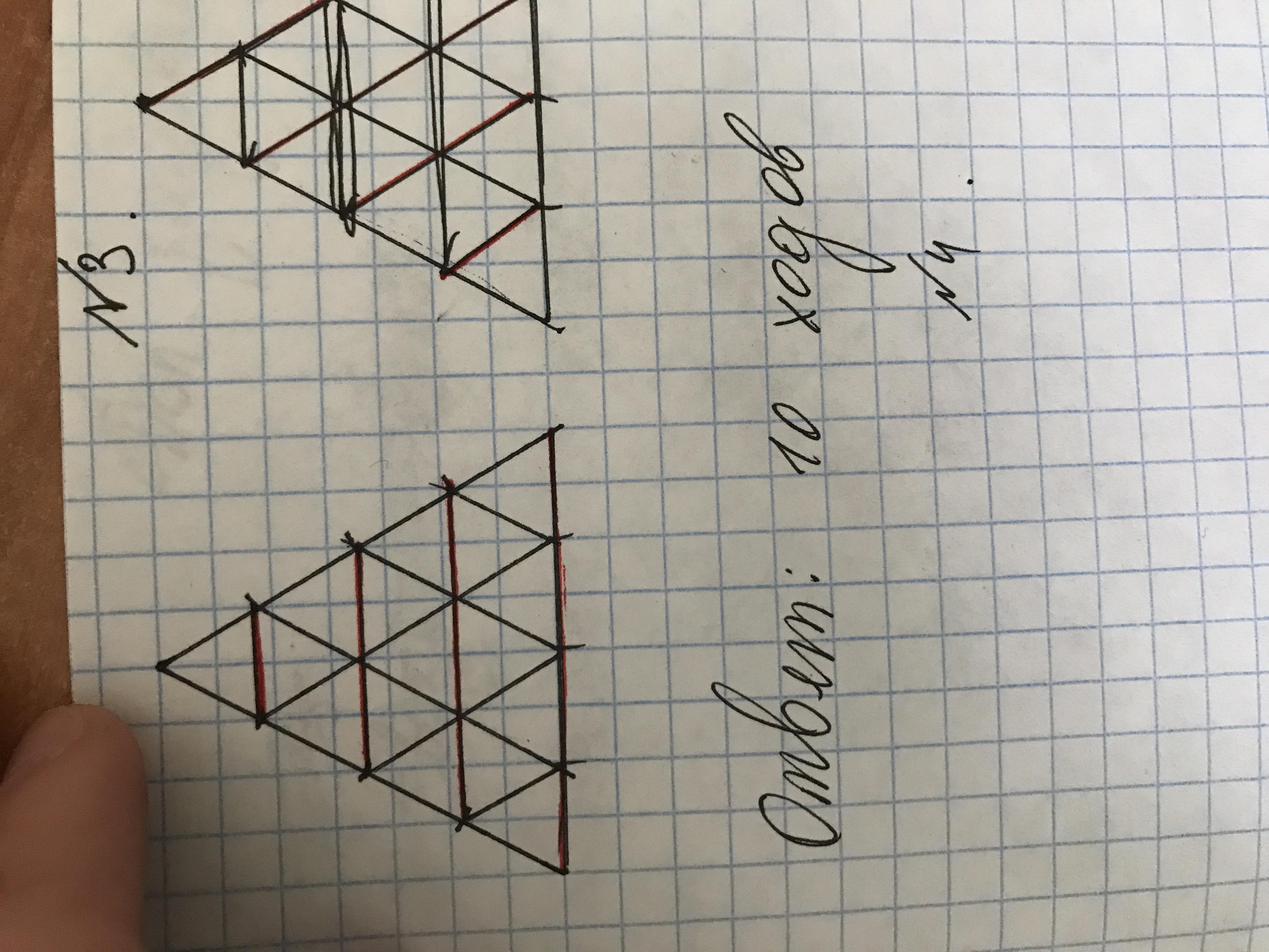 За ход разрешается стереть любую одну сторону у любого из маленьких треугольников. За какое наименьшее число ходов можно добиться того, чтобы у каждого маленького треугольника была стёрта по меньшей мере одна сторона?