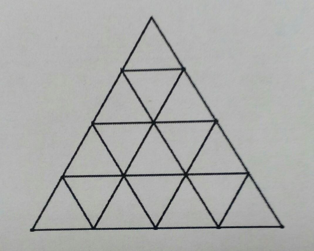 Правильный треугольник со стороной длины 4 разбит параллельными сторонам линиями на 16 маленьких треугольников со стороной длины 1, как показано на рисунке: