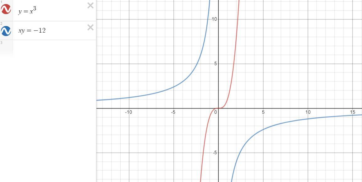 график функции у=х³ проходит через третью и первую четверти, а график функции у=-12/х лежит во второй и четвертой четвертях, поэтому они не пересекаются и общего решения нет