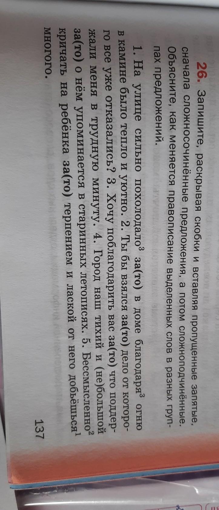 1. На улице сильно похолодало, зато в доме благодаря огню в камине было тепло и уютно. 2. Ты бы взялся за то дело, от которого все уже отказались? 3. Хочу поблагодарить вас за то, что поддержали меня в трудную минуту. 4. Город наш тихий и небольшой, зато о нём упоминается в старинных летописях. 5. Бессмысленно? кричать на ребёнка, зато терпением и лаской от него добьёшься многого.