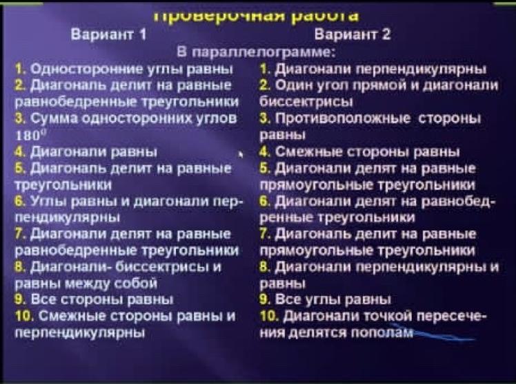 6)в квадрате или прямоугольнике все углы равны и диагонали перпендикулярны, в обычном параллелограмме противоположные углы равны а диагонали не перпендикулярные