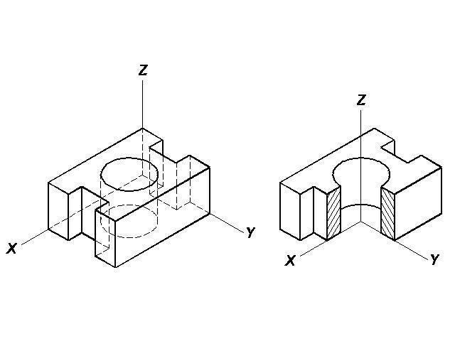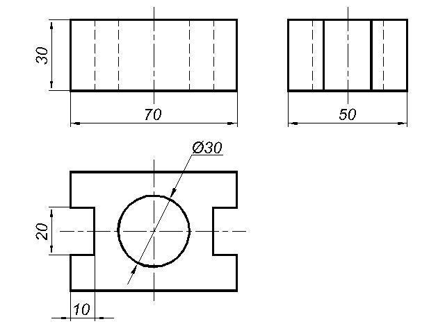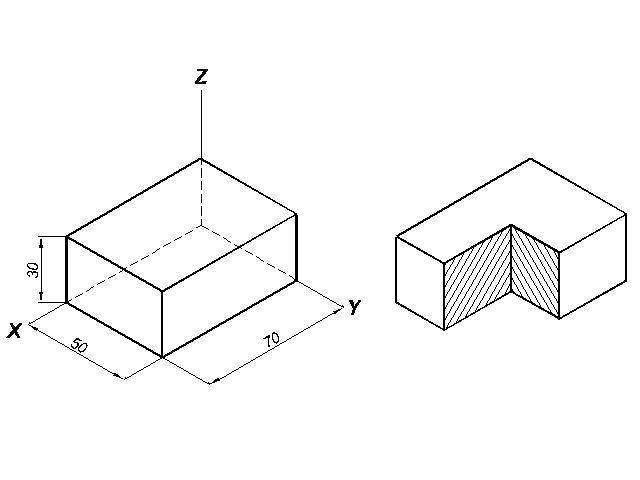 2. По габаритным размерам вычертить параллепипед. Вычертить все проемы и отверстия, соблюдая размеры. Рассечь деталь, удаляя 1/4 часть и построив аксонометрический разрез. Грани, попавшие в секущую плоскость, обозначить штриховкой. Нанести размеры