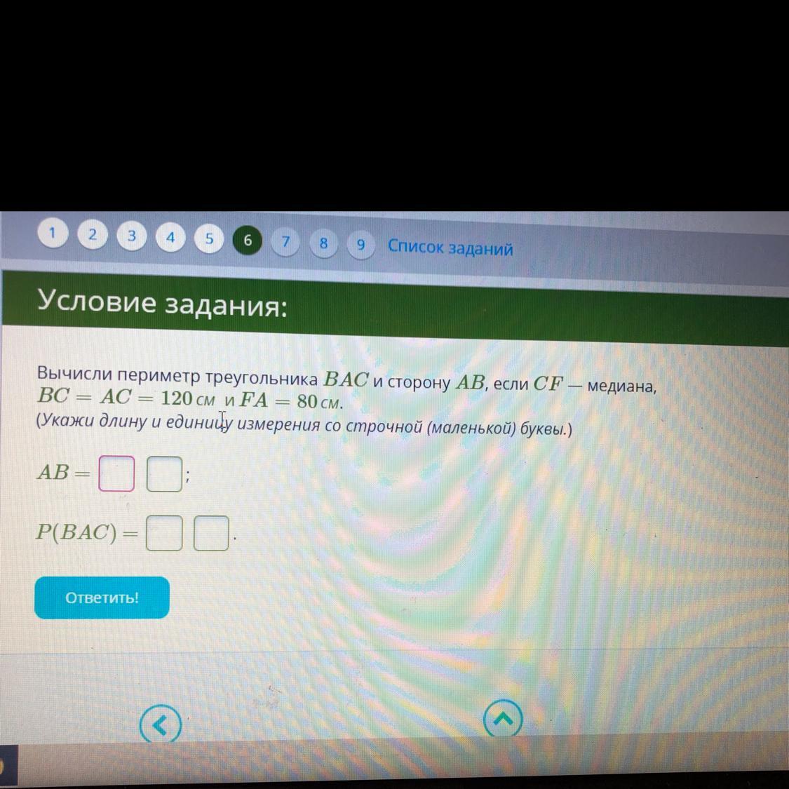 Вычисли периметр треугольника ВАС и сторону AB, если CF.