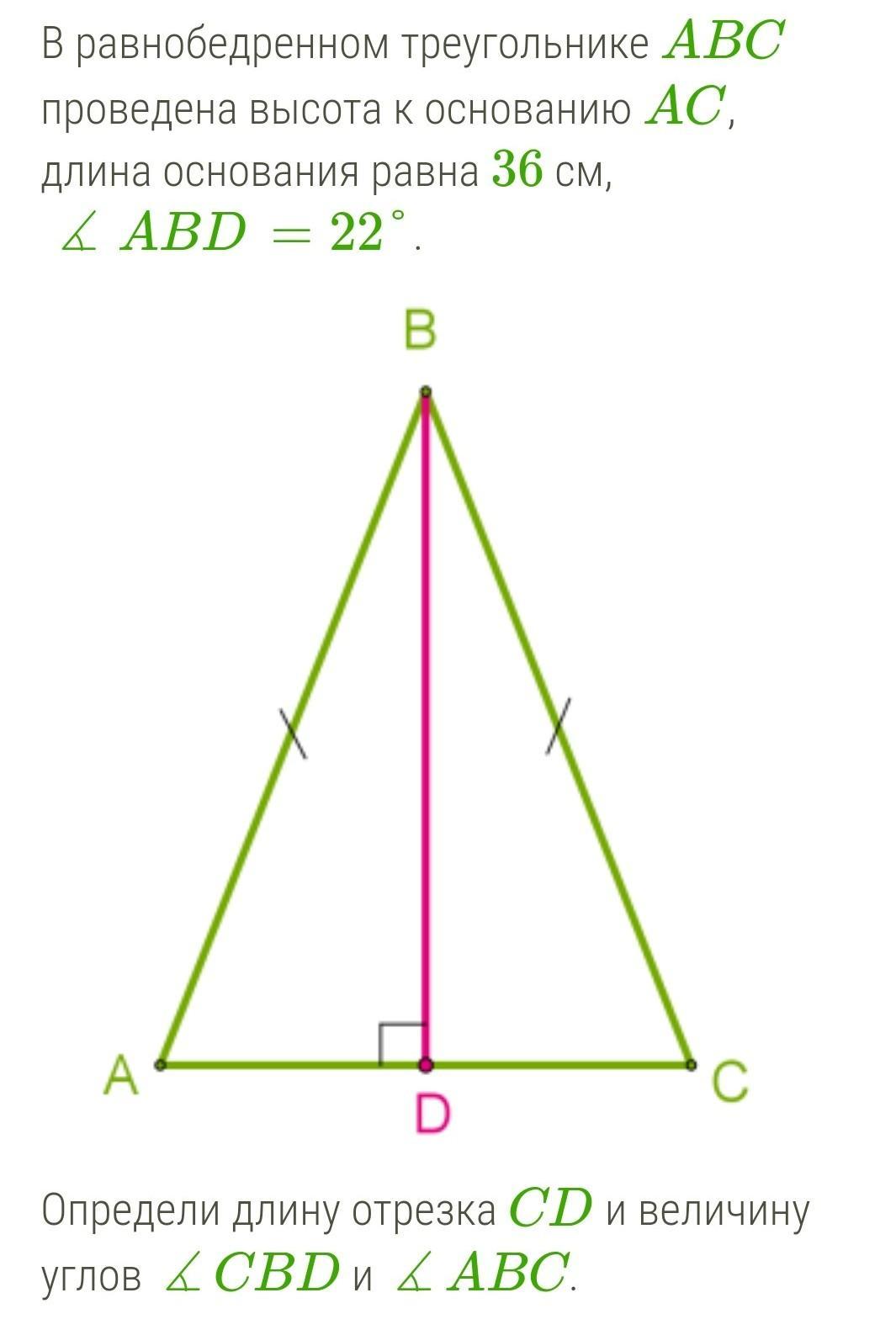 CD=36÷3=18 см и угол CBD=углу ABD=22° , это все т.к. высота проведённая к основанию равнобедренного треугольника является и медианой и биссектрисой.