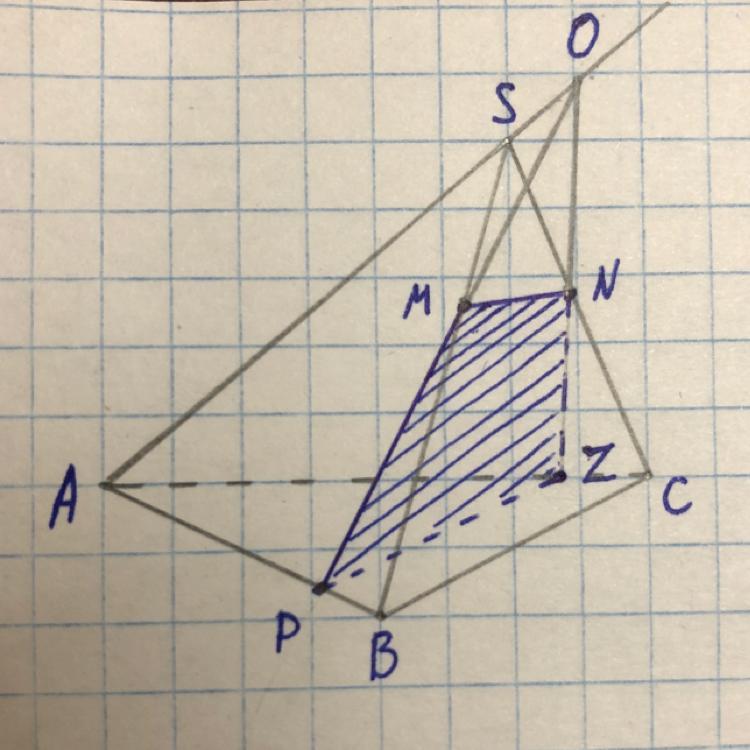Для построения сечения во-первых надо соединить точки, которые нам даны, а именно точку P с точкой M, точку М с точкой N. Во-вторых для нахождения четвёртой точки (Z) надо продолжить сторону AS и PM до пересечения в точке О, после этого проводим отрезок из точки О до переменит со стороной АС и ставим точку Z. Далее соединяем точку Z с точкой Р. получившееся сечение закрашиваем.