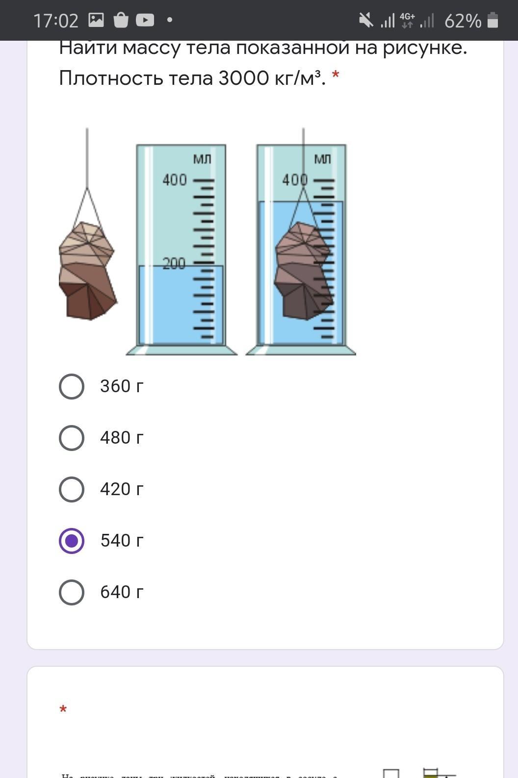 Значит разница между показаниями уровней воды будет 140мл. Это и есть объём данного тела. Или если перевести-0,00014м^3. Найдём его массу по формуле m=pV, где p-плотность тела, a V-его объём. Получается 0,42кг или 420г.