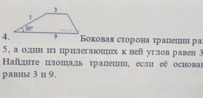 Боковая сторона трапеции равна 5,а один из прилегающих к ней углов равен 30° . Найдите площадь трапеции, если её основания равны 3 и 9. Распишите подробно и понятно!!!