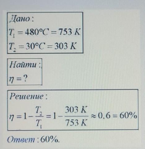 каков КПД идеальной паровой машины если пар поступает в турбину при температуре 480 градусов по Цельсию выходит из неё при температуре 28 градусов ответ Представьте в процентах