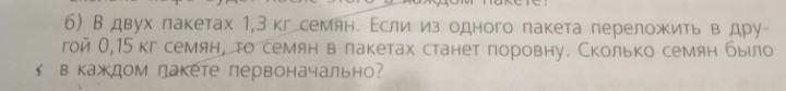 Общее количество семян не изменится, значит в каждом пакете их будет по 1.3кг/2 = 0.65кг. В первом пакете было на 0.15кг больше, то есть 0.8кг, а во втором - на 0.15кг меньше, то есть 0.5кг