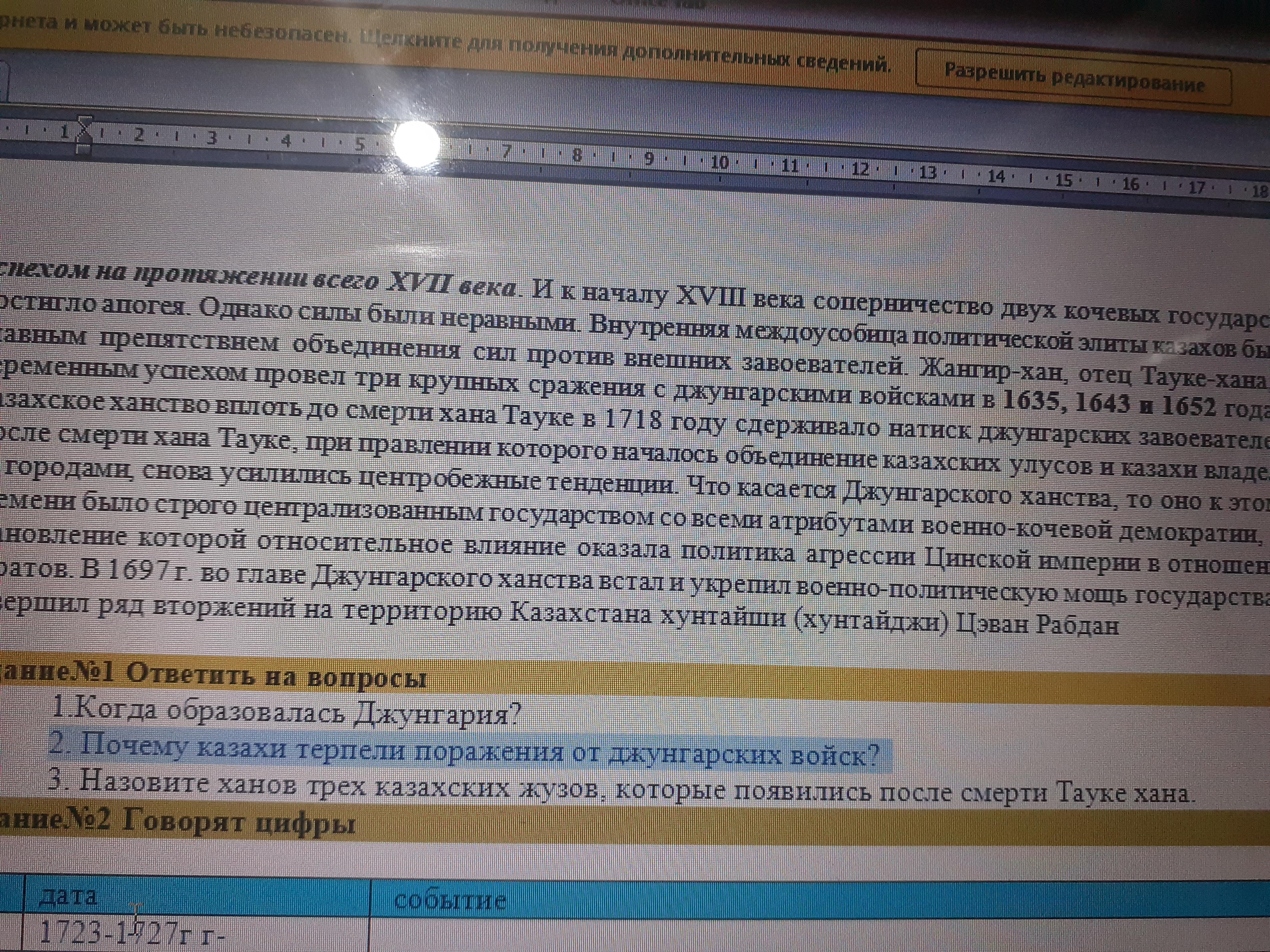 2.Основная причина поражения казахов от джунгар : А. Недостаточный военный опыт В. Раздробленность казахских родов С. Отсутствие единого военачальника D. Отсутствие огнестрельного оружия Е. Усиление Джунгарского государства. Количество казахского населения , погибшего впоследствии джунгарских нашествий : А. Двадцать пять процентов населения В. Две трети степного населения С. Пятьдесят процентов населения D. Одна вторая часть населения Е. Одна пятая часть населения.