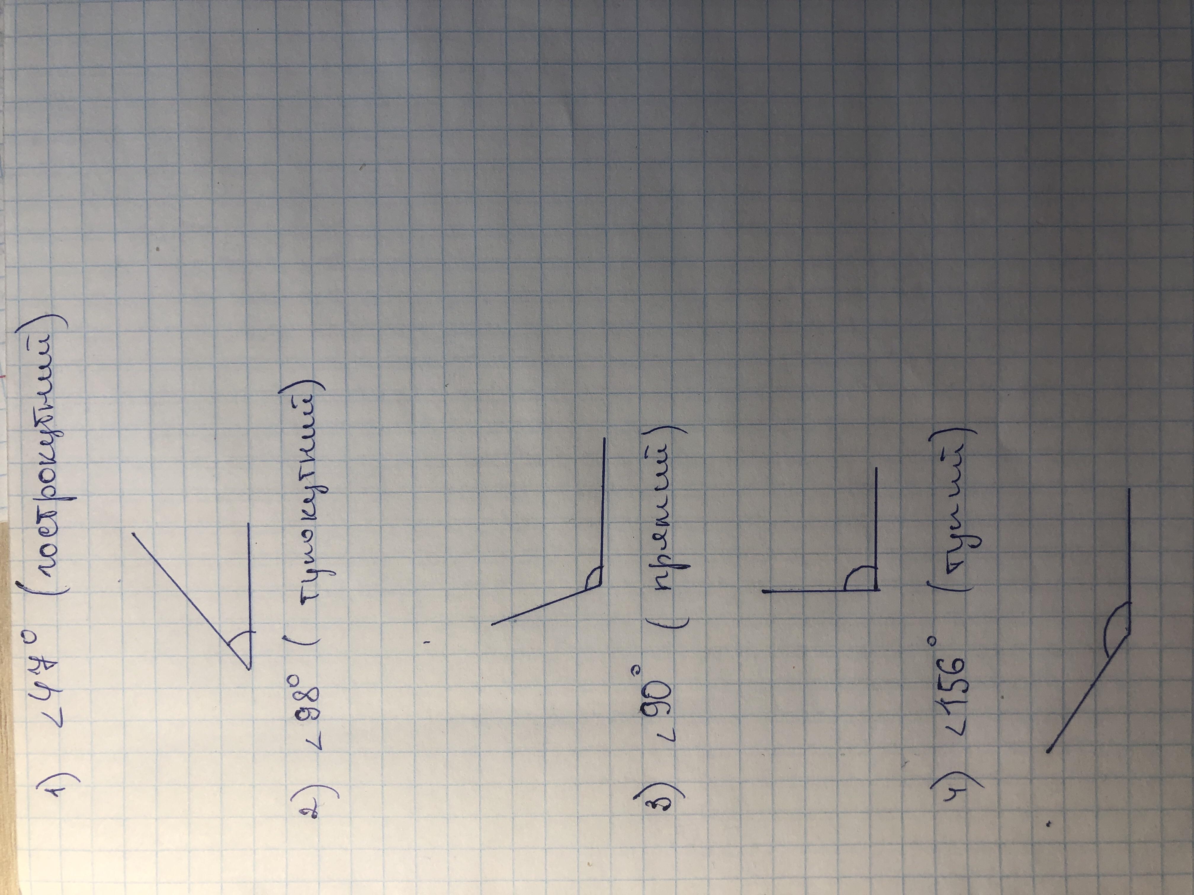 ; 3) 90°; 4) 156°. Визначте вид кожного кута.
