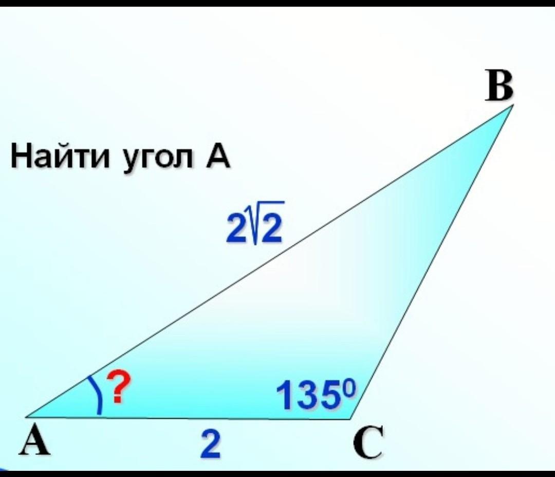 по теореме синусов: 2√2/sin135°=2/sinB; sinB=2sin135°/(2√2)=1/2, ⇒ ∡B=30°, ⇒ ∡A=180-135-30=15°.