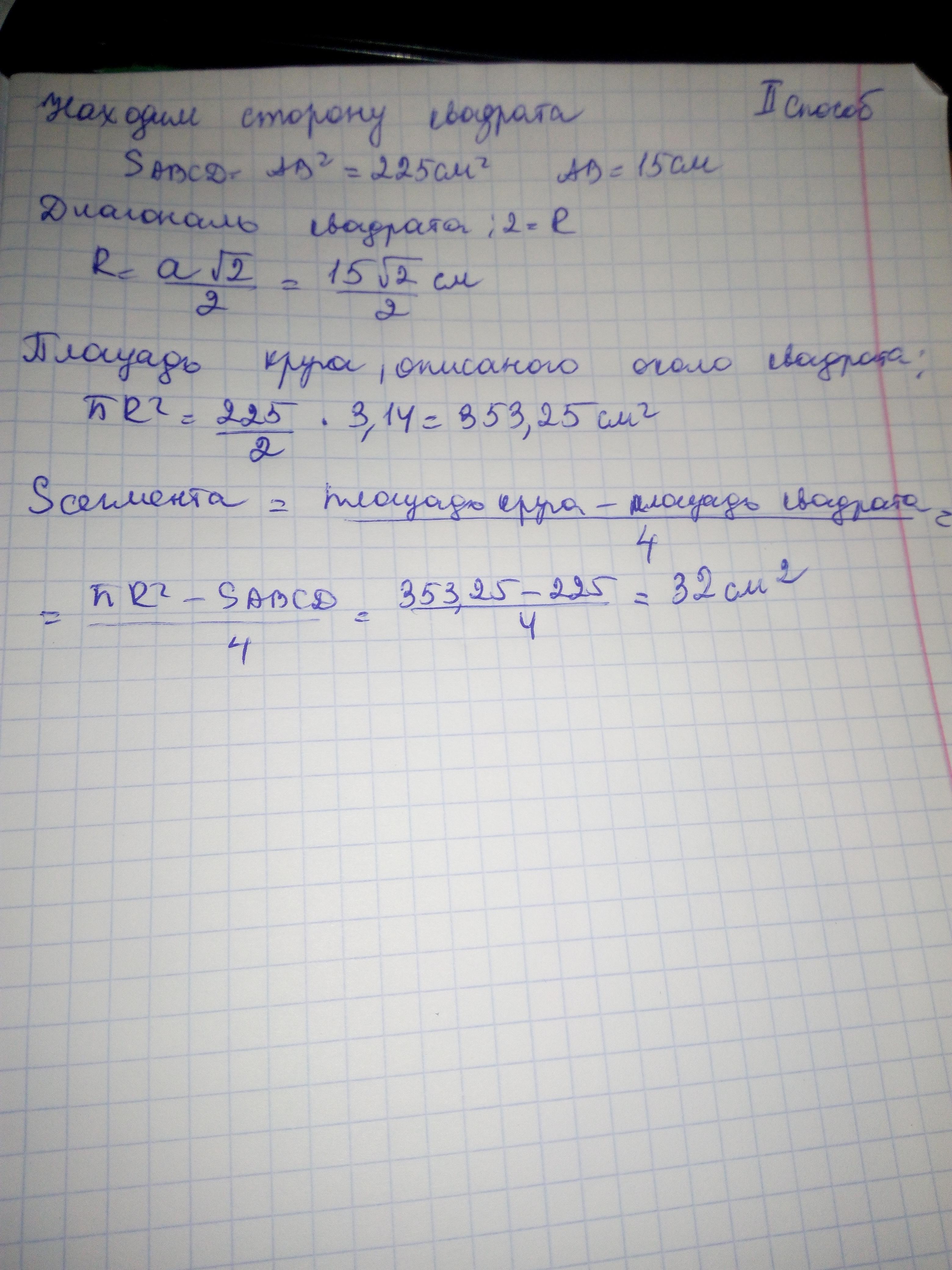 Площа квадрата, вписаного в коло, дорівнює 225 см² . Знайди площу сегмента, основою якого є сторона квадрата.