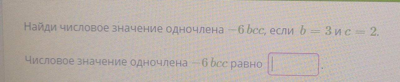 Найдите числовое значение одночлена -6bcc, если b=3 и c=2.