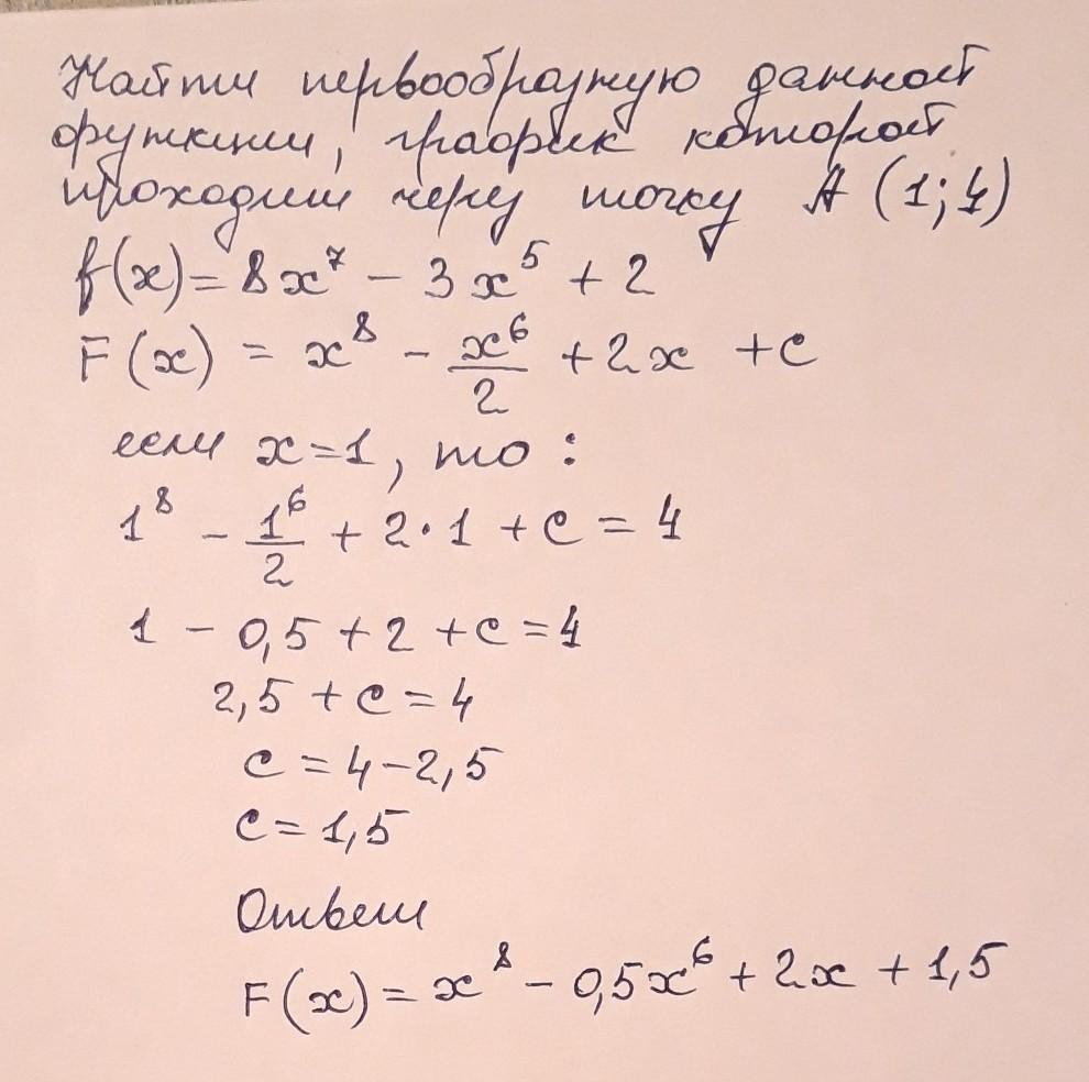Знайдіть первісну даної функції, графік якої проходить через задану точку: f(x)=8x^7-3x^5+2; A(1;4)