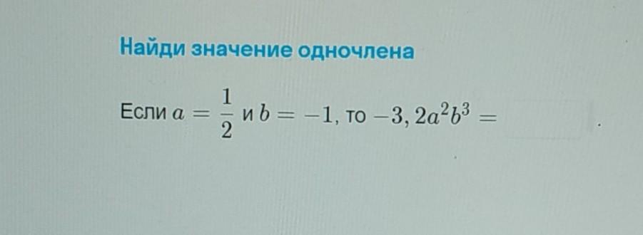 - 3.2  {a}^{2}  {b}^{3}  =  - 3.2 \times  {( \frac{1}{2} )}^{2}  \times  {( - 1)}^{3}  =  -  \frac{16}{5}   \times \frac{1}{4}   \times ( - 1) =  \frac{4}{5}  = 0.8