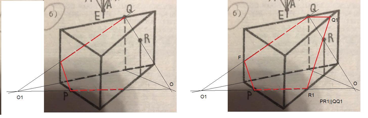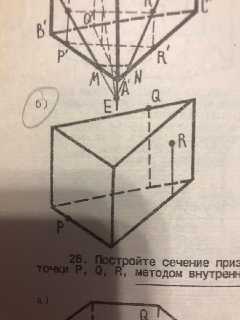 ДАЮ 95 БАЛЛОВ. Помогите с задачей. Постройте сечение треугольной призмы плоскостью, проходящей через точки P, Q, R, методом внутреннего проектирования.
