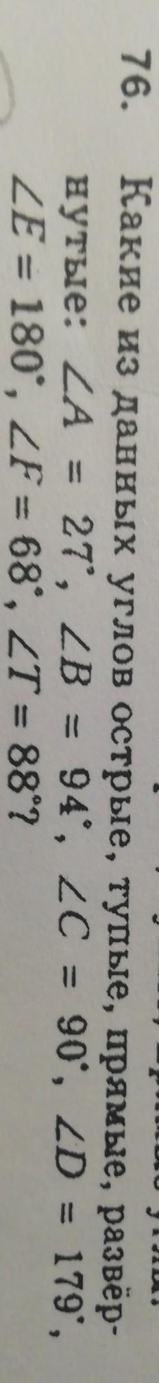 A - острый, B - тупой, C - прямой, D - тупой, E - развёрнутый, F - острый, T - острый.