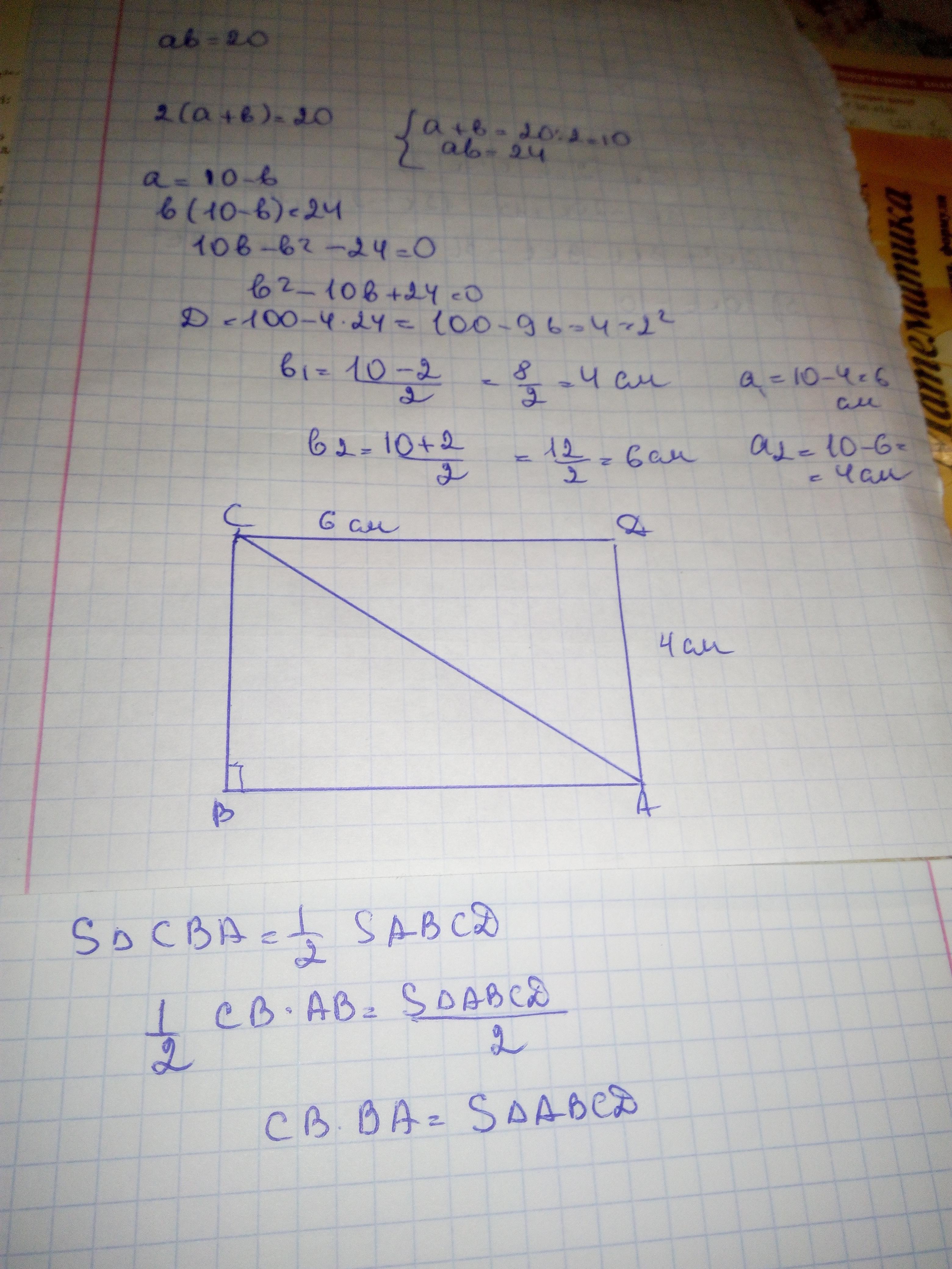 Откуда х=6 и х=4 (тогда другая , смежная сторона будет 10-х т.е 4 или 6)
