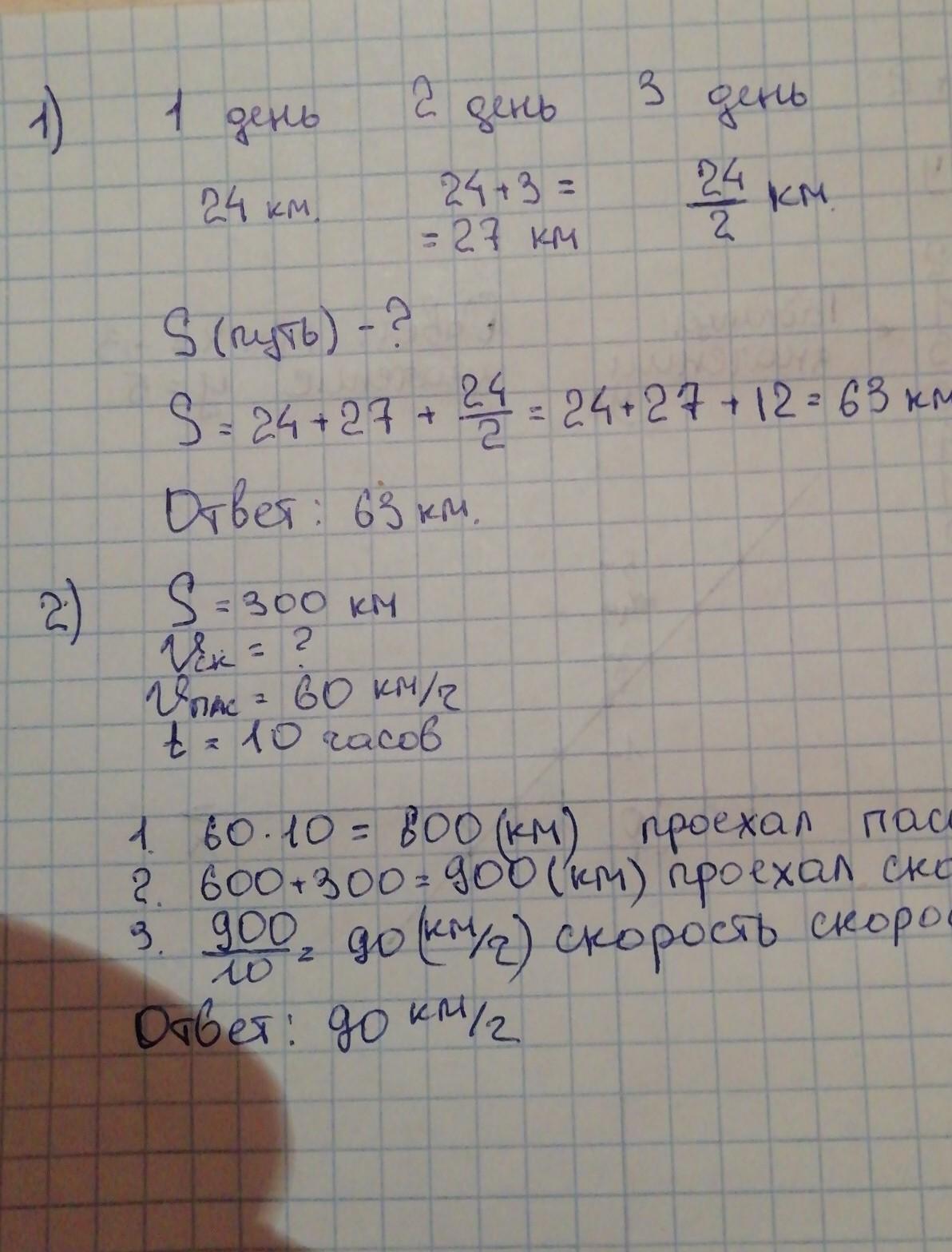1) Весь маршрут туристы прошли за 3 дня. В первый день они прошли 24 км, во второй день – на 3 км больше, а в третий день – в 2 раза меньше, чем в первый. Сколько км составил весь маршрут?