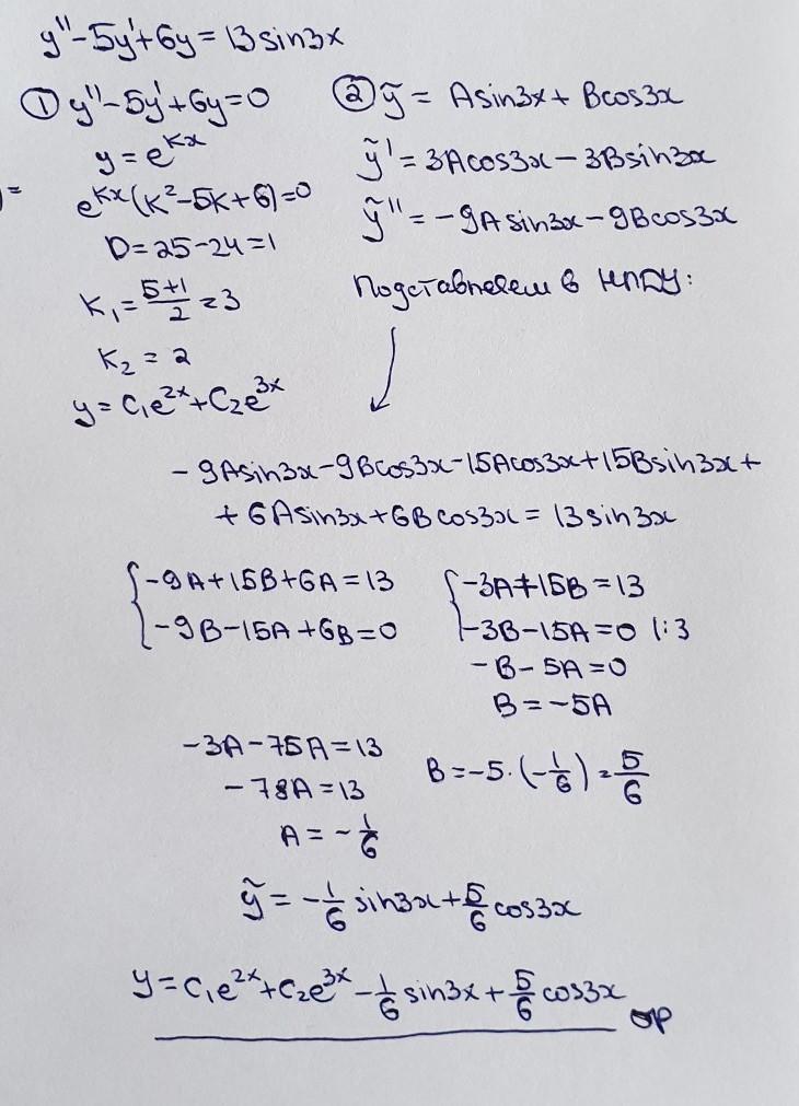 Помогите решить уравнение y '' - 5y ' + 6y = 13sin3x.