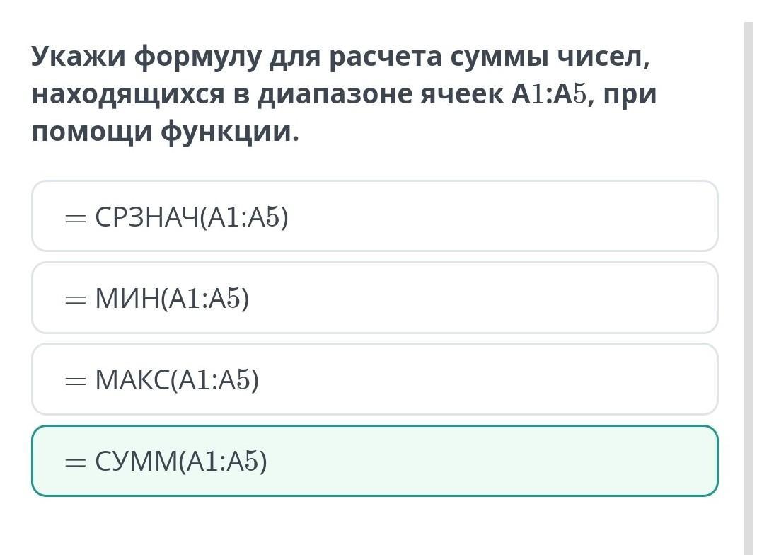 Укажи формулу для расчета суммы чисел, находящихся в диапазоне ячеек А1:A5, при помощи функции.