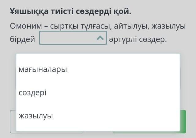 Ұяшыққа тиісті сөздерді қой. Омоним – сыртқы бірдей мағыналары сөздері жазылуы тұлғасы, айтылуы, жазылуы әртүрлі сөздер.