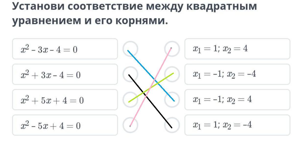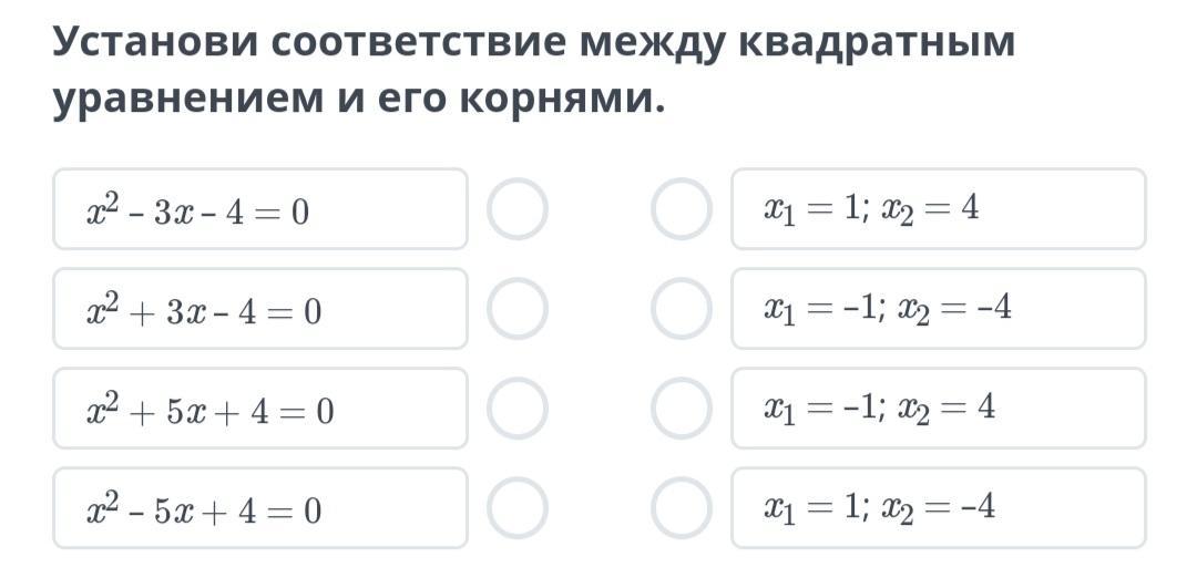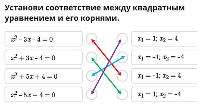 Решение квадратных уравнений. Урок 3 Установи соответствие между квадратным уравнением и его корнями.