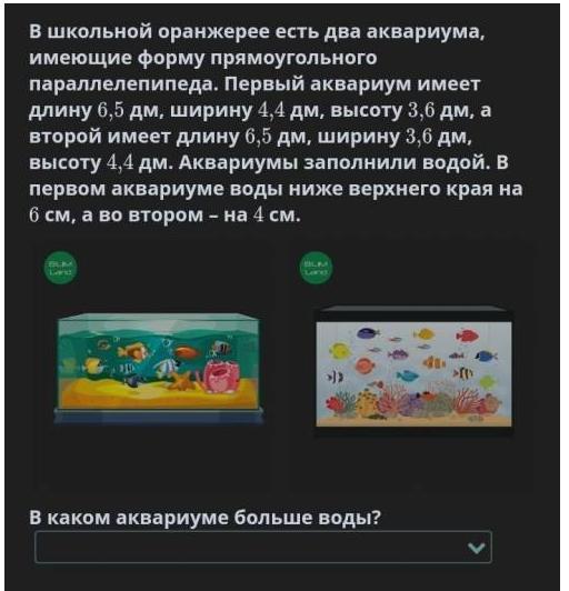 Первый аквариум имеет длину 6,5 дм, ширину 4,4 дм, высоту 3,6 дм, а второй имеет длину в,5 дм,