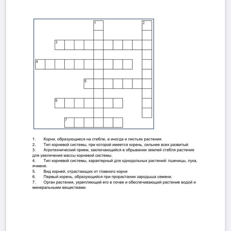 Ответ:1,придаточные,2стержневой,3,окучивание,4,мочковатая,5, боковые,,6,зародышный корешок,7,вегетативный