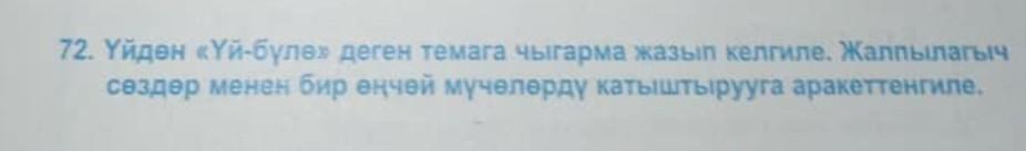 Менин уйбулом абдан чон, жана ынтымактуу. Уй булом менен убакыт откоргонду жакшы кором. Биз саякаттаганды жакшы коробуз. Мисалы жайкы каникулдарда биз тоого чыгып гул терип, таза абага эс алып, сейилдегенди жакшы коробуз. Кышында болсо чана тебебиз, кар киши жазайбыз, Жаны жылда тоскондо салют атабыз! Куз кандай керемет! Мен ( байкем и тд) менен сурот тартып, сап-сары жалбырактарды чогултуп апабызга белек кылабыз